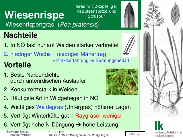 HUMER: „Die Wiesenrispe stetzt sich wie hier in NÖ und auch in Österreich oft nur selten durch. Meist nur auch nur kleine Handteller grossen Flächen.“ BUCHGRABER dagegen setzt Wiesenrispe in besonders hohen Anteilen in Nachsaatmischungen von 30% (NA) bis 55% (KWei) ein.