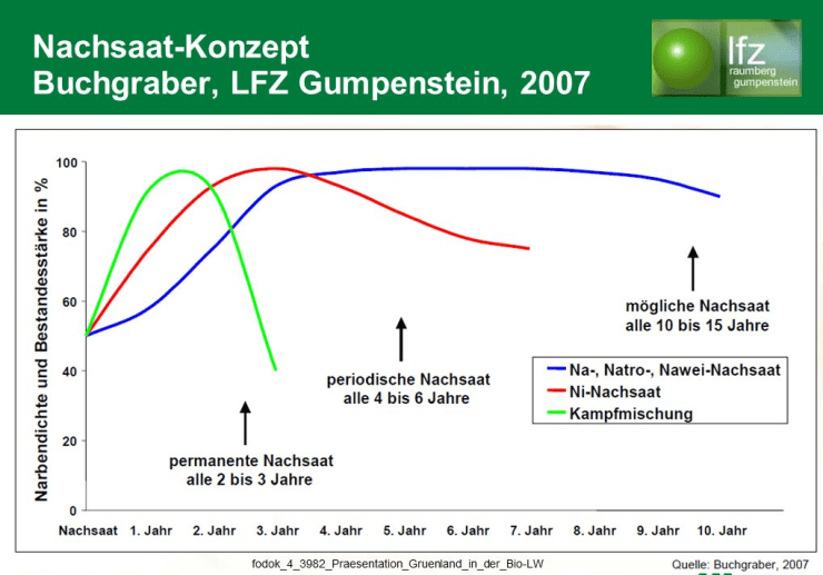 Warum behauptet BUCHGRABER, ohne Versuchsbeweis, dass seine NA-Nachsaat-mischungen bis zu 10 Jahren eine fast 100%ige Narbendichte und Bestandesstärke haben?