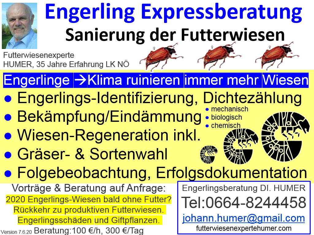 Jedes Frühjahr können lückige Futterwiesen mit der Narbenreparatur verbessert werden. Gelungene Einsaaten mit Kosten von 200-300 €/ha mit 2 Säterminen mit je 10 kg Saatgut/ha/Jahr bieten sogar die Chance auf Verdoppelung der Erträge ab dem dritten Einsaatjahr. Diese rentable Investition leisten standortgerechte Grassorten, die jeder Grünlandwirt für seine Standorte selber identifizieren und festlegen kann. Auskünfte, Kurse und Beratung zur standortgerechten Gräserwahl bietet der bewährte Gräserführerschein zum Erkennen und Bewerten der Gräser für standorgerechte Saatgutmischungen sowie die LK-Grünlandberater und der Autor, Futterwiesenexperte HUMER an.