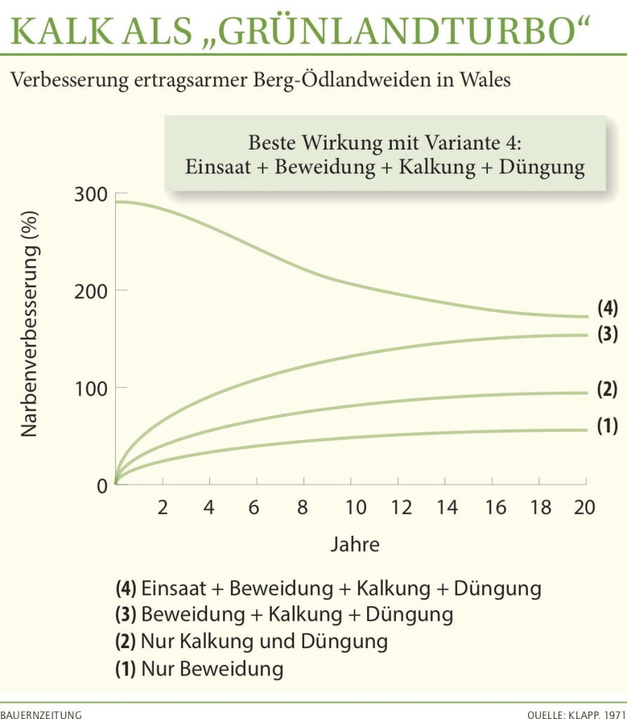 Grünland-Einsaaten bedürfen für einen guten Wuchs genug Kalk im Boden, damit die Versorgung mit Nährstoffen, Luft und Wasser durch das Bodenleben gut funktioniert. Kalk verbessert auch die Bodenstruktur wodurch der Boden besser durchlüftet wird und das Wasser besser speichern kann. Kalkung verbessert sohin die Keimbedingungen, da Regenwürmer in neutralen und kalkreichen Böden für eine bessere Mineralisierung von Nährstoffen sorgen.