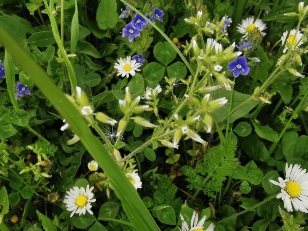 Ausbreitung von Hornkraut, Ehrenpreis, Schafgarbe und Gänseblümschen auf einem trockenen Südhang. wo nun keine Düngung und Kalkung mehr erfolgt am 13.5.2023.