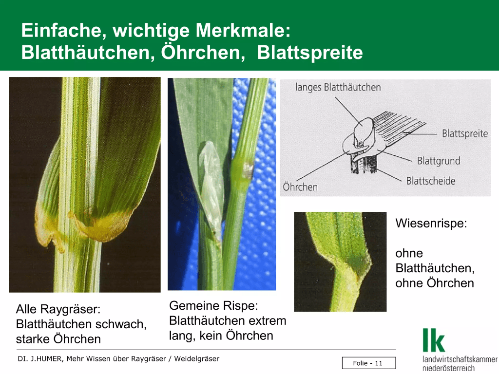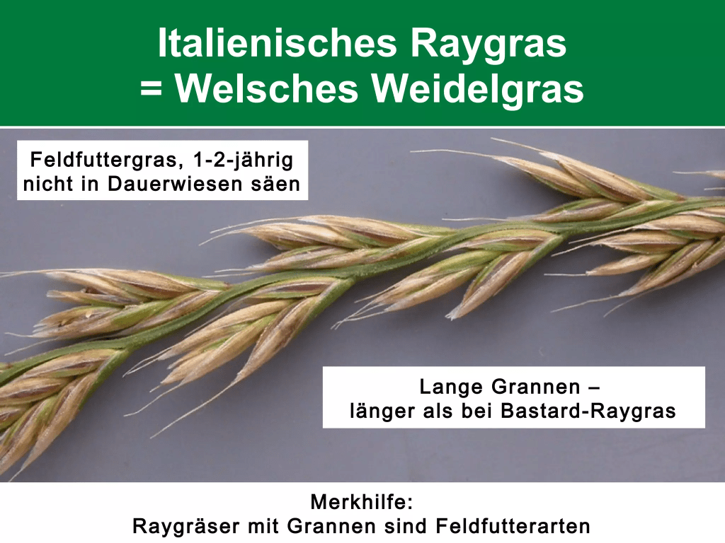Alle diesem Gras ähnlichen massenwüchsigen Feldfutter Weidelgräser / Raygräser haben als Kennzeichen stark begrannte Ähren, ein starkes Blattöhrchen und im obersten Stängelteil eine erscheinende stammrunde und nicht gefaltene oberste Blattanlage. Dazu folgende Bestimmungshilfen aus meinen Grünlandvorträgen.