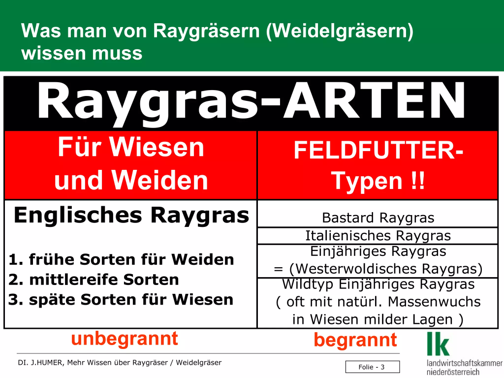Raygräser oder Weidelgräser kann man man folgenden Nutzungstypen einteilen. Eine gute Unterscheidbarkeit gibt dabei die Begrannung der Ähre.
