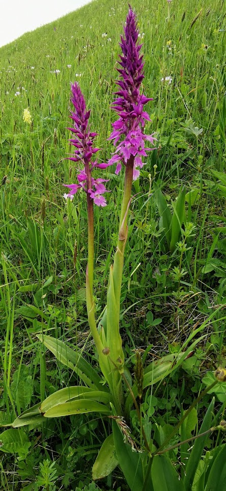 Auf der noch steileren oberen Seite wachsen dort schon mehrere Knabenkräuter als Zeichen eines ungedüngten Hanges, der doch noch mit dem Motormäher gemäht wird. I -