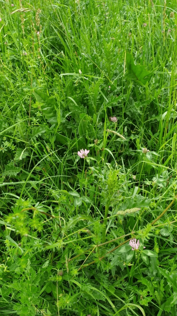 Das Bild zeigt eher eine trockene und magere Lage der Weide an, da der Bestand viel Wiesenkabkraut, als auch Wiesenrotklee, Wiesenrispe und Ruchgras aufweist. Da könnte neben Raygras, Rotschwingel, Wiesenrispe und Hornklee von Vorteil sein.
