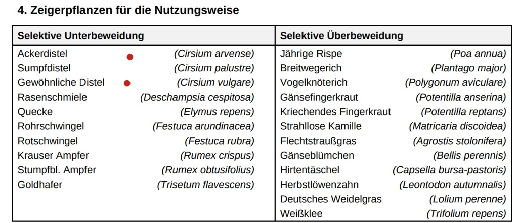 Bei der vorliegenden Kratzdistel sind es primär ein lokales Überangebot bei Stickstoff, zum Beispiel durch Kot u Harn durch Viehläger. Die Kratzdistel deutet auch auf mögliche Bodenverdichtungen hin, ZB durch Überweidung bevorzugter Stellen.